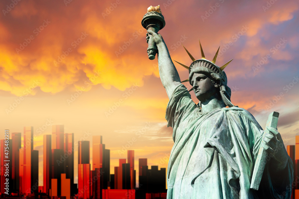 Statue of Liberty USA. American Statue of Liberty at sunset. Rendering of city skyline in background. Symbol of democracy in United States of America. Monument located in New York.