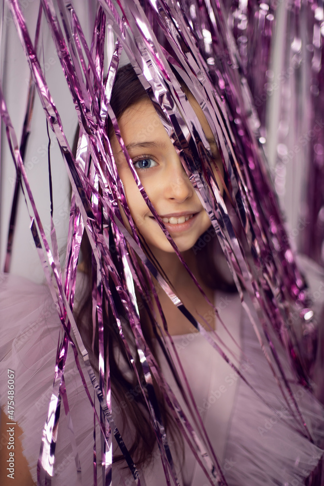 beautiful girl with big eyes in a pink dress stands against the background of New Year tinsel