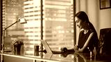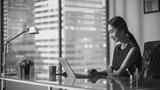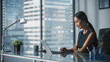 Successful Businesswoman in Stylish Dress Sitting at a Desk in Modern Office, Using Laptop Computer, Next to Window with Big City View. Successful Finance Manager Planning Work Projects.