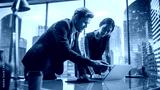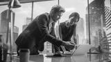 Portrait of Successful Corporate CEO and Finance Manager Talking, Using Laptop Computer while Standing in City Office. Stock Market Investors Negotiate e-Commerce Business Purchase.