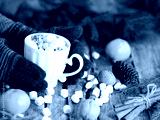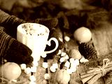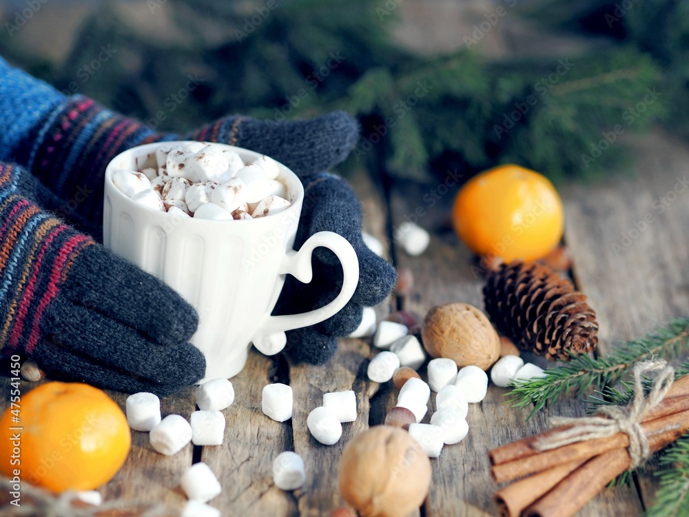A woman with her hands in warm gloves holds a mug of cocoa with marshmallows on a wooden background with fir branches and natural decorations.