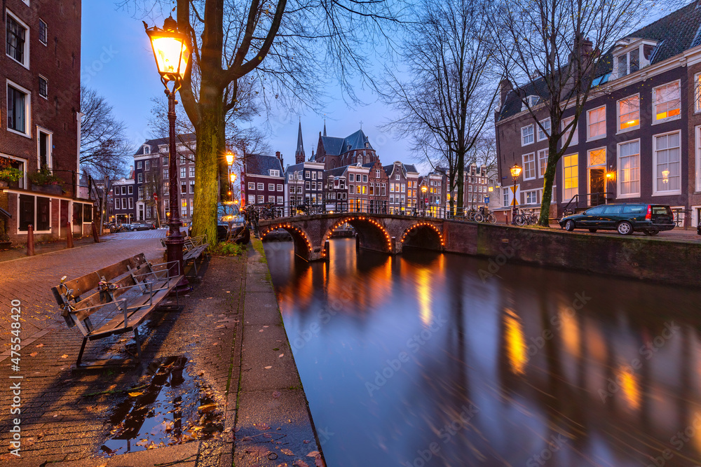Amsterdam canal Leidsegracht with typical dutch houses and bridge during evening blue hour, Holland, Netherlands