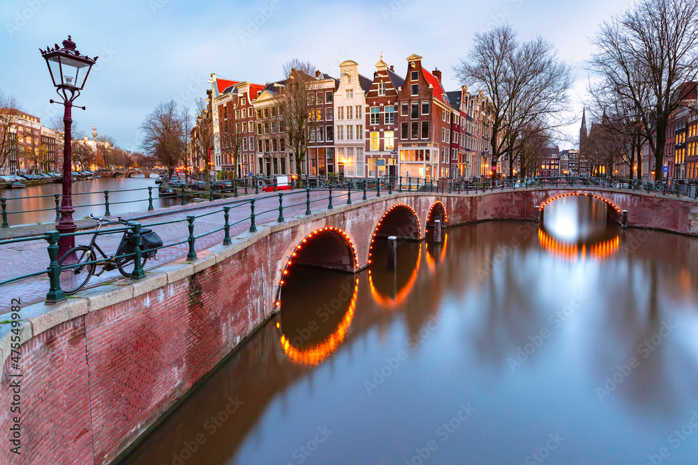 Amsterdam canal Keizersgracht with typical dutch houses and bridge during morning blue hour, Holland, Netherlands