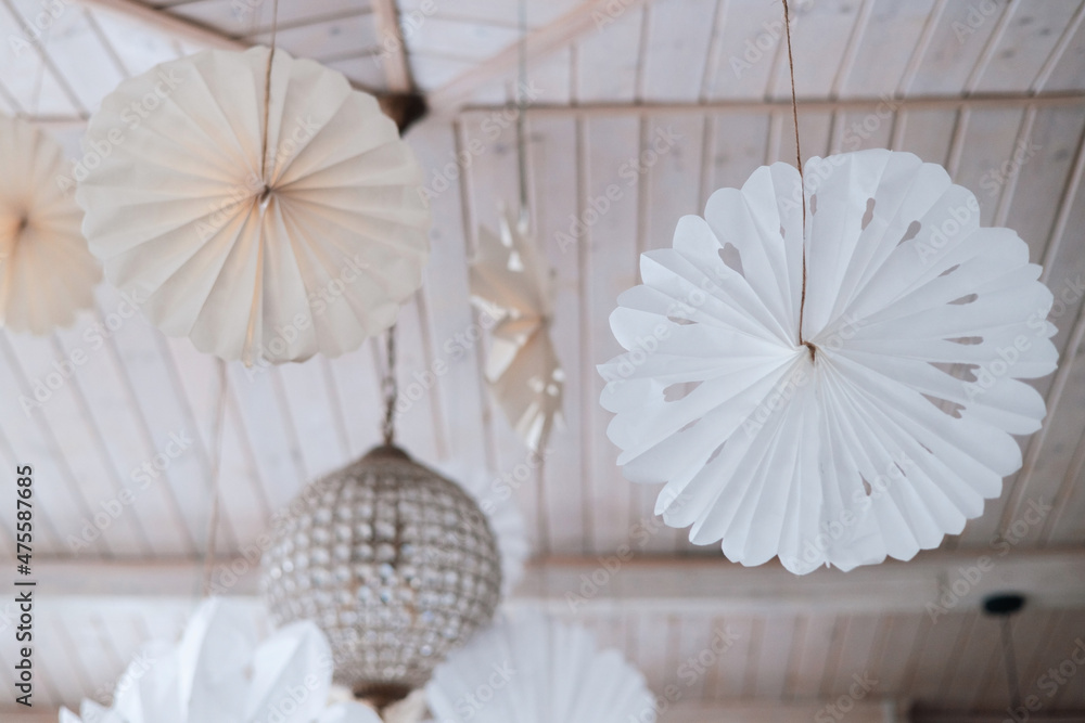 White and beige round paper handmade decorations on the ceiling. Honeycomb Interior design