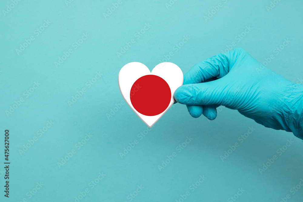 Medical workers hand wearing surgical glove holding Japan flag heart
