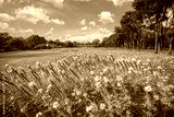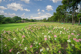 Beautiful pink blossoms flower and blue sky in public park with green grass field.