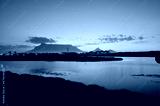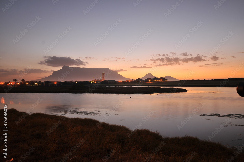 Table Mountain Panoramic Landscape with Beautiful Colorful Sunset and Streaking Clouds Landscape, Cape Town, South Africa. Sunset over the river.