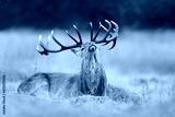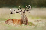 Close up of a red deer stag lying on grass