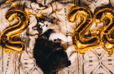 Christmas cat 2022. Black cute kitten with gold foil balloons number 2022 new year on festive cozy knitted blanket at sweet home. Good New Year spirit. Ready postcard 2022. Happy New Year animal, pet