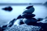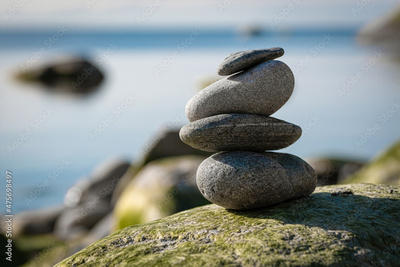 Zen stone pyramide with blurred sea shore background. Stack of balancing pebbles on the beach. Beauty, nature, meditation, harmony and stability concept. Selective focus, close up, copy space