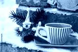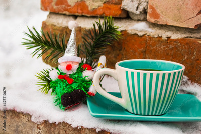 Christmas grandpa on a green set cup with a saucer with black coffee