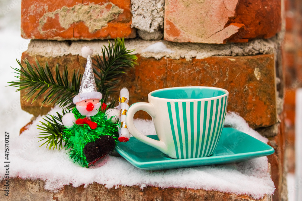 Christmas grandpa on a green set cup with a saucer with black coffee