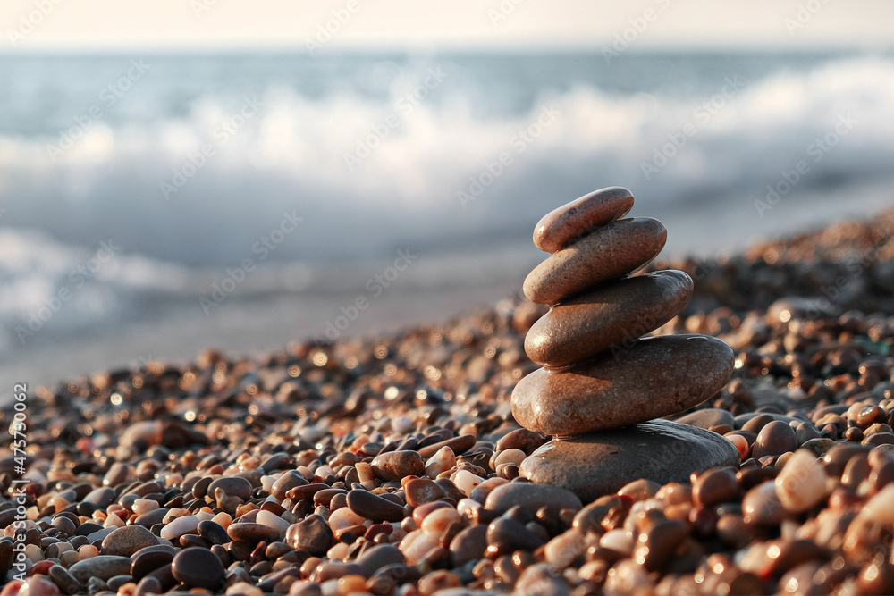 Balance of stones on the sea. Pebble pyramid at sunset. Sea waves in blur.