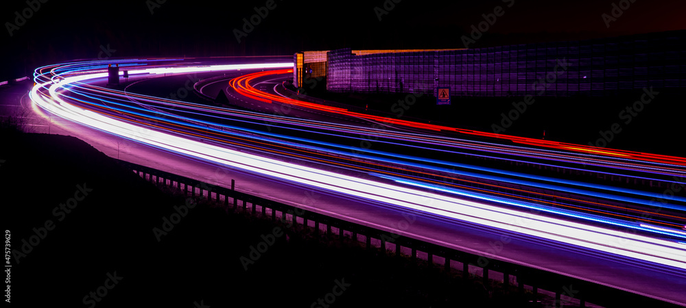 Night road lights. Lights of moving cars at night. long exposure red, blue, green, orange.