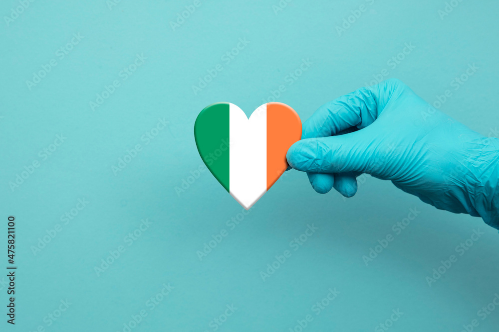 Medical workers hand wearing surgical glove holding Ireland flag heart