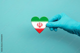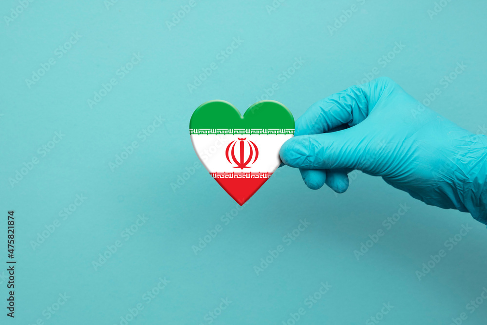 Medical workers hand wearing surgical glove holding Iran flag heart
