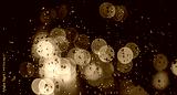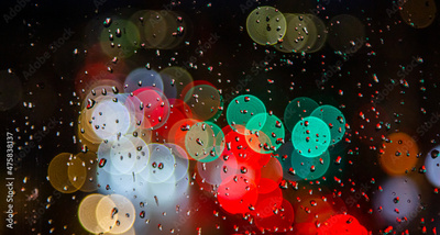 rainy night in the city, rain drops on the window surface and moving traffic bokeh light