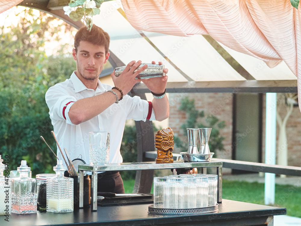 Young attractive Caucasian barman shaking a cocktail at an outdoor party around a swimming pool