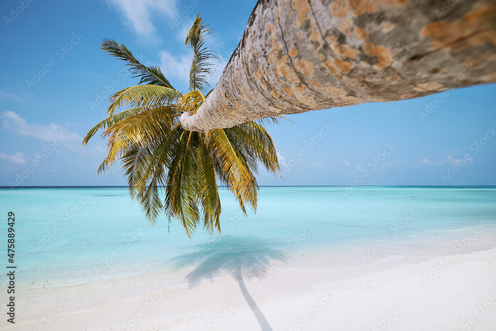 Palm tree on idyllic white sand beach. Turquoise color of sea in Maldives.