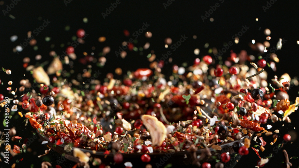 Freeze motion of flying mix of spice on black background.