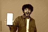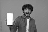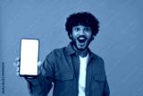 Excited young indian man holding cellphone showing big white blank empty mockup screen. Surprised guy advertising betting app on phone isolated on blue background. Smartphone application ads