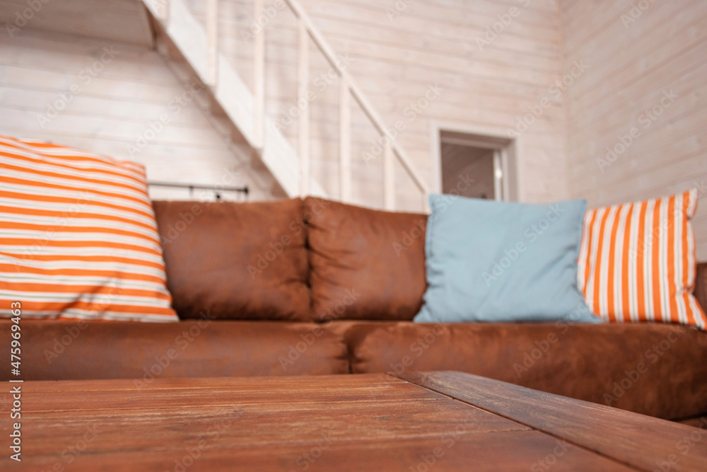 Wooden brown table in home vintage interior and leather couch in wooden house
