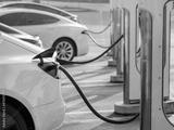 Electric cars charging at charging station outdoors at sunset.