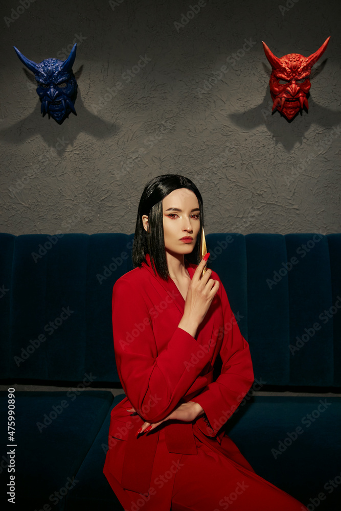 Anime woman in a red suit with short hair cut, black hair. A killer girl in a red jacket with a dagger in her hand. Beauty portrait