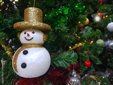Snowman Doll on branch of Christmas Tree with Colorful Balls decoraion as Christmas or Newyear Festival Concept.