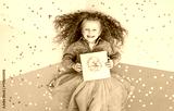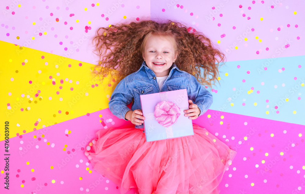 little girl with gift in hands laughs rejoices on colorful background with confetti birthday celebration concept top view