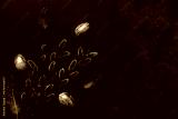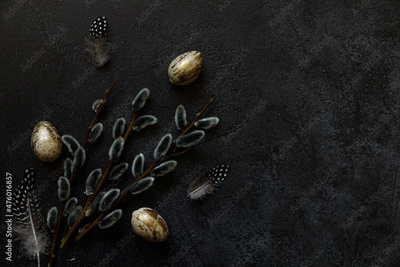 Happy Easter concept. Preparation for holiday. Golden decorated easter eggs willow feather on trendy grunge scratched dark black shale background. Simple minimalism flat lay top view copy space