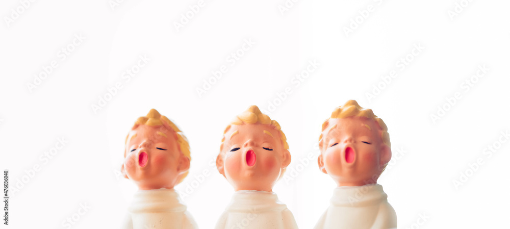 Christmas caroling or Carolers singing outside with snows.Angel group singing carol song on celebration of Christmas day in winter time.banner black background.Worship, Church, Catholic celebration.