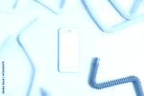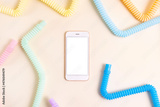 Mobile phone and Trendy kids toys pastel colorful pop-tube on beige background. Set of forms and colors corrugated pipe and anti stressing, relaxation fidget finger toys and technology .
