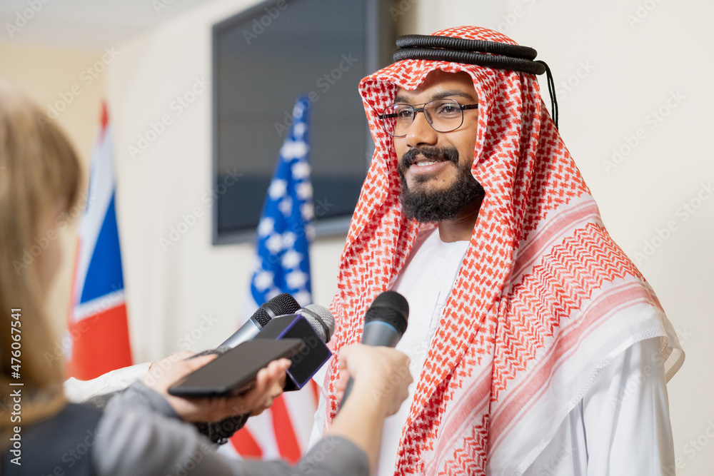 Young Arabian businessman in national clothes giving interview to journalists after political event in conference hall