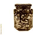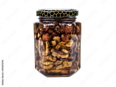 walnut, hazelnut and honey in the jar on white