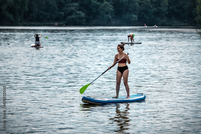 young woman stands on sup board holds paddle in her hand and floats