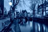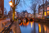 Amsterdam canal Leidsegracht with typical dutch houses and bridge during evening blue hour, Holland, Netherlands