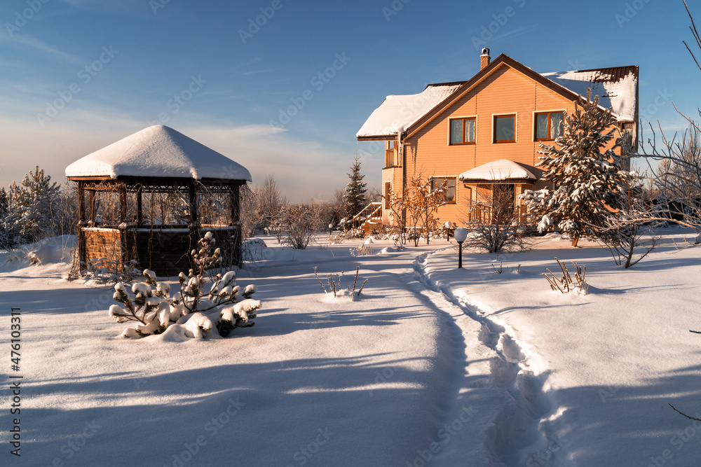 Winter landscape in countryside and Country house with tiled roof and chimney.