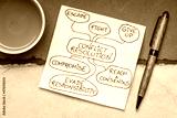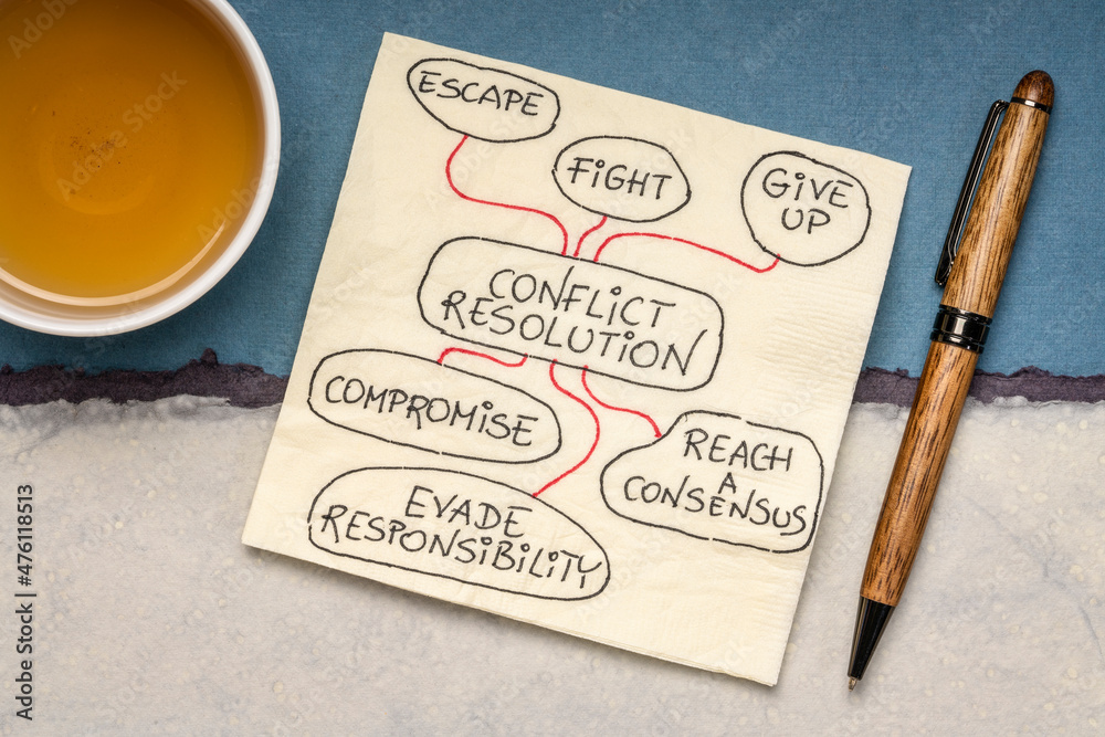 conflict resolution strategies - doodle on a napkin with a cup of tea, business and personal development concept
