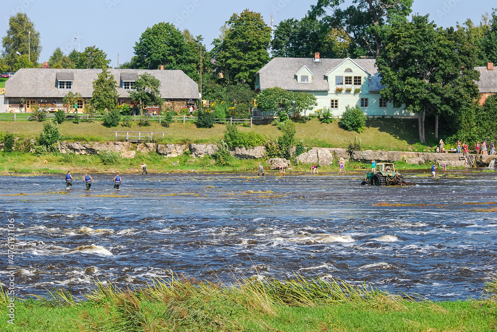 The tractor drives along the river and cleans it of reeds. People are also working to clean up the river
