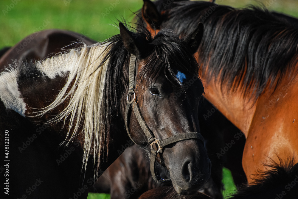 Portrait of a dark brown horse grazing on an sunny summer day