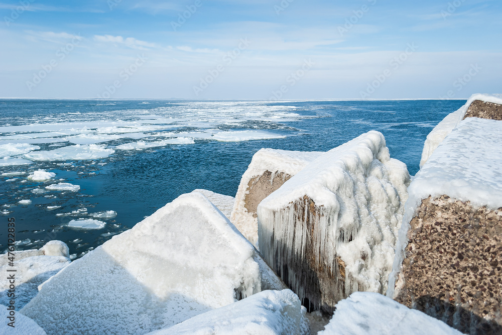 Frozen Baltic sea and concrete tetrapods in sunny winter day. Port entrance and breakwater. Ventspils, Latvia
