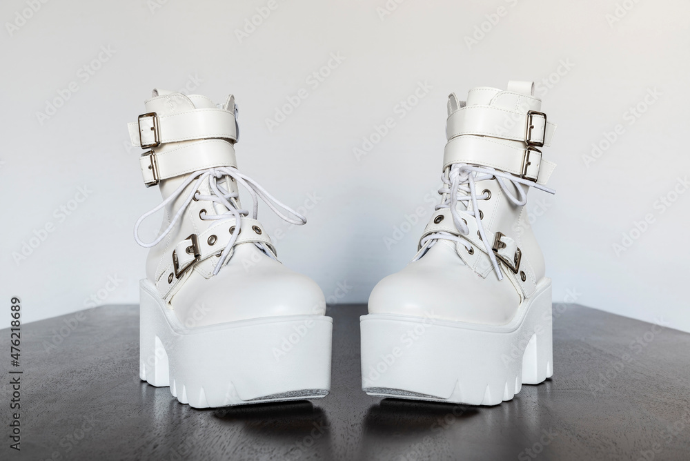 White platform boots with buckles and laces