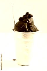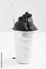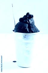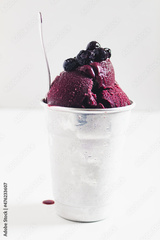 Acai ice cream and blueberries on white background. Flat lay, top view. Spring, summer concept.