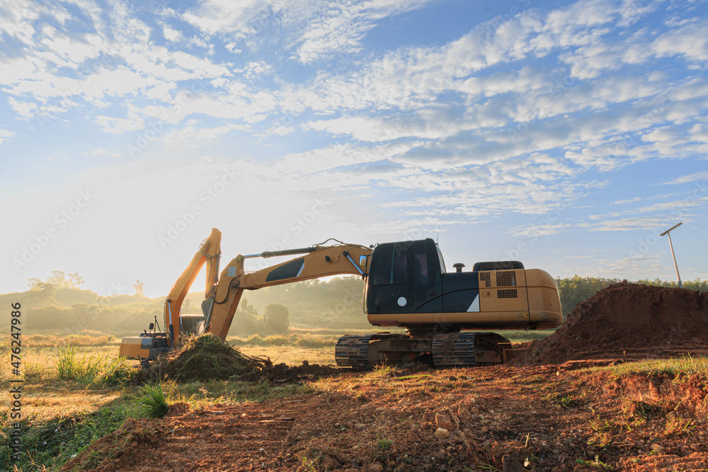 Two Crawler Excavator is digging in the construction site pipeline work with cloud and sky background.in field