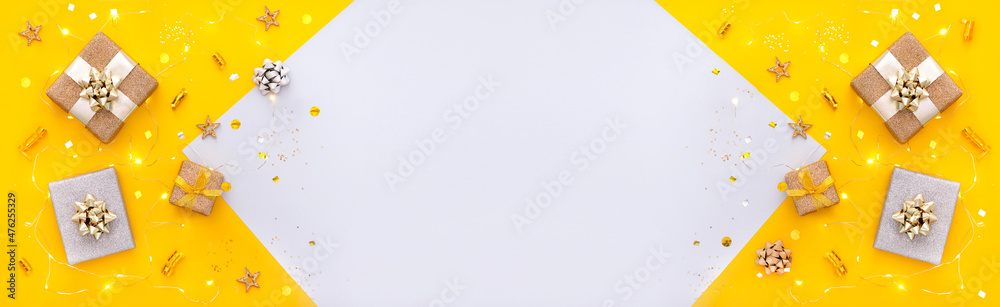 banner composition decor gifts christmas lights on a yellow bright background top view with place for text