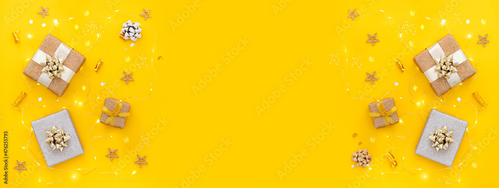 banner composition decor gifts christmas lights on a yellow bright background top view with place for text