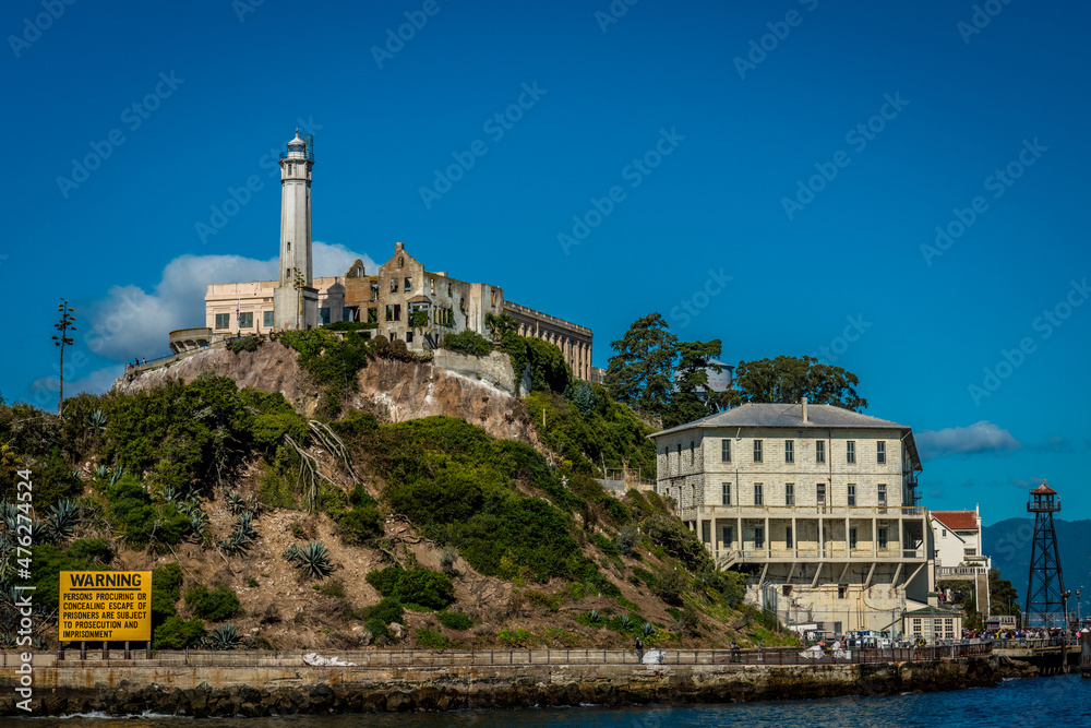 Beautiful scene of a building in Alcatraz Island, USA with a blue sky