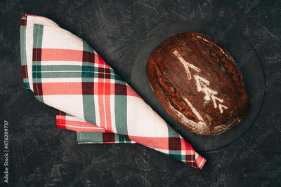 Freshly baked warm delicious rye round bread close-up and a kitchen checkered towel. The concept of healthy eating