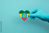 Medical workers hand wearing surgical glove holding Ethiopia flag heart